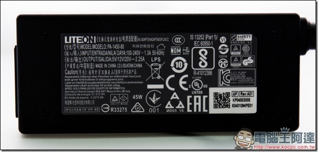 充電器的部分,本身可以接受100~240V、1.3A 的電力,基本上囊括了世界各國的電力了,輸出部分則是5V/12V/20V、2.25A: