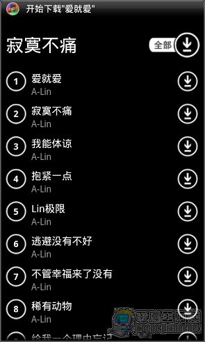 如果想一口氣把整張專輯下載的話,點擊右上角的「全部」即可,在資訊清單中就可以看到曲目在批次下載中: