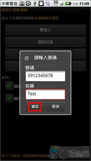 設定的方法很多,可由聯絡人、通話記錄、SMS記錄或手動輸入號碼: