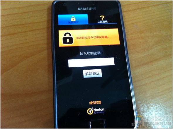 如此您的Android裝置就會被鎖定,除非輸入密碼不然無法開啟,筆者試過把手機關機後重開,在進入主畫面前就直接鎖死了,其他人連移除「諾頓行動安全」的機會也沒有: