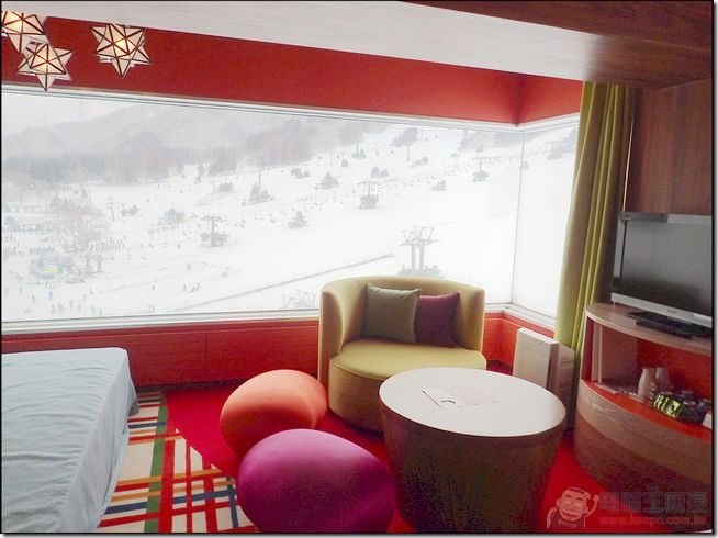 另一個四人房型則是標準四人房,沒有黑板、吊床等遊戲設施,不過由窗戶看出去則是雪場: