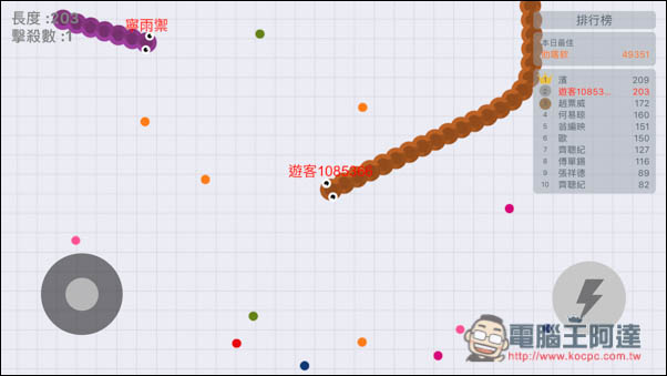 首先是無盡模式,在這模式下不會有時間限制,有點類似死鬥,看你能撐到多長以及擊殺多少玩家,即便死掉也只是重來,讓你不斷地玩下去!而操作介面有兩個功能,左下為控制方向,右下則是加速。玩家行徑過程中吃到路上的小圓點後,身體就會不斷變長,但當按下加速建後,就會遺失一些小圓點,進而導致身體變短,主要是用來擊殺別人。