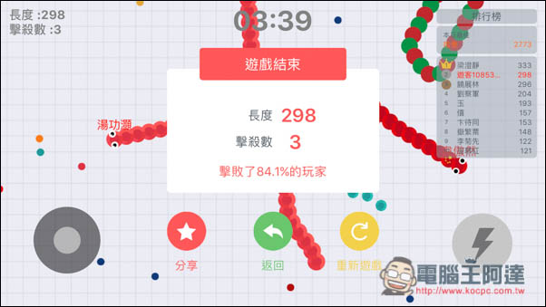 死掉之後也會顯示這場的得分結果,長度多少以及擊殺數量。