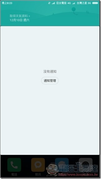 由螢幕最上方往下拉,可呼叫工作面板,並可用左右滑動的方式切換訊息通知與快捷鍵功能: