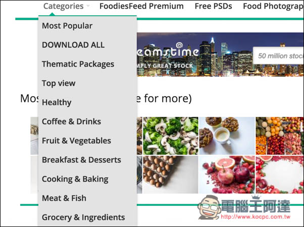 foodiesfeed 每一張食物圖片不論是構圖、顏色等等都非常不錯,且不得不說,有時候找素材時,肚子還會不小心餓了起來(笑)。進入到首頁就能感受到那滿滿的豐富色彩,有一些簡單的分類,但我建議可以直接到上方的 Categories 尋找。