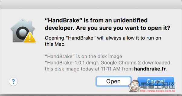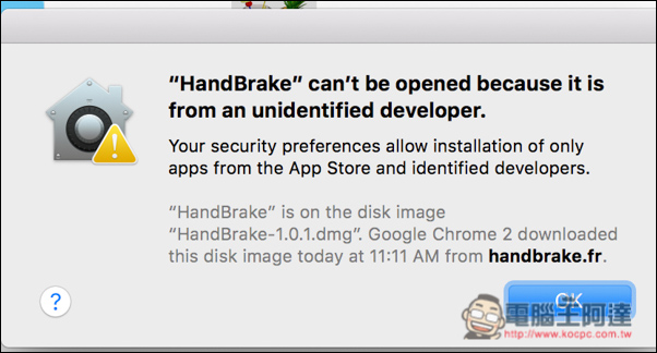 Mac 下載完後可以直接執行 Handbrake,不需要進行安裝動作,不過打開時可能會跳出身份不明的開發者應用,導致沒辦法使用,這時你必須進到 Mac 的設定。