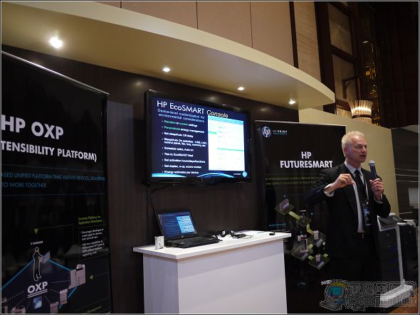 一開始到達的區域主要介紹的是HP OXP(OPEN EXTENSIBILITY PLATFORM;開放式擴展平台)與HP FUTURESMART,HP OXP主要功能是讓企業用戶的MIS方便管理企業中所有的列印裝置,可達到方便遠端集中管理、界面統一、節省成本與節能省電的目的,在實際的案例中剛好使用了台灣的南山人壽使用了HP的企業方案,每年的成本節省了600萬元,紙張的使用率也減少了15%,遠端電源管理更多可節省66%的用電量:
