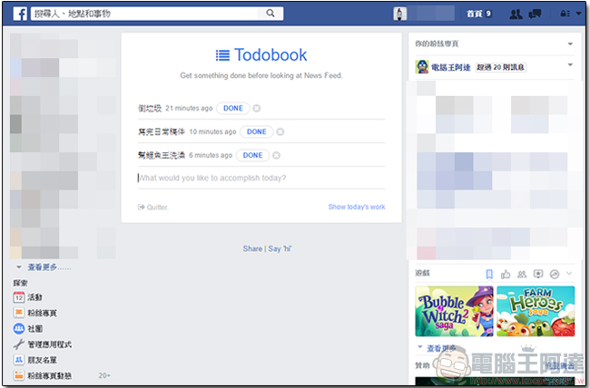 坐在電腦前一打開瀏覽器就直覺開啟 Facebook 頁面看看,猛一驚覺才發現自己又浪費好多時間,真正該做的事情早已被拋到腦後,這樣怎麼行呢?管不住自己的手就讓 Todobook 來幫你!