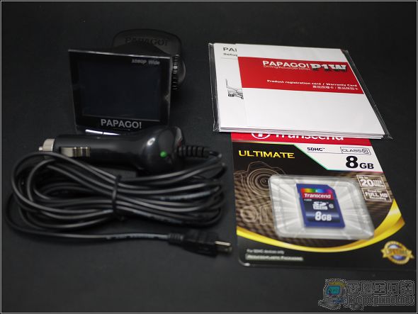 機絲點點名,P1W本體、車充、說明書與隨機附贈的8GB記憶卡: