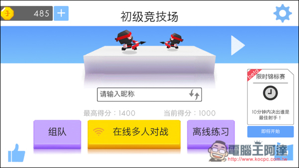 弓箭手大作戰其實支援繁體中文介面,筆者一開始忘記切換,點選右上角的設定圖示即可更改,內建二種遊戲模式,“線上多人對戰” 以及 “離線模式”,新手上路的玩家當然先到離線模式磨練一下。