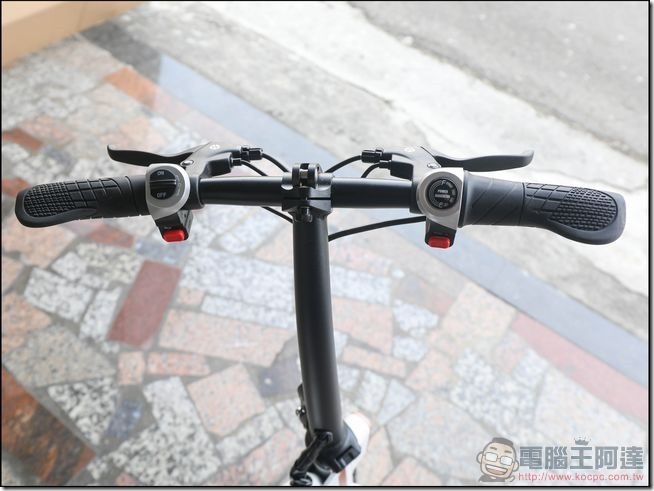 手把部分也可以轉向,往下凹可以收納的更小,騎乘時就可以直接扳出來: