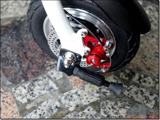 Inmotion 樂行 P1電動車的另一個我個人蠻喜歡的就是他前後輪都採用碟煞機構,煞車反應很靈敏且迅速,但太靈敏的另一面來說就是急煞時會有感覺會「翻車」的感覺,不過因為車身不高,正常來講可以用雙腳輔助避免這種情況發生。另外 Inmotion 樂行 P1電動車的前後輪也不一樣大,前輪為12吋、後輪為10吋,這樣的設計為了讓重心更加穩定而考量,輪胎都是可以充氣的設計,對於比較顛簸的路面有一定的緩衝作用:
