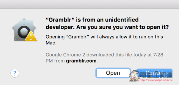 下方會顯示 Gramblr 被擋的訊息,點右側的“打開(Open Anyway)”。