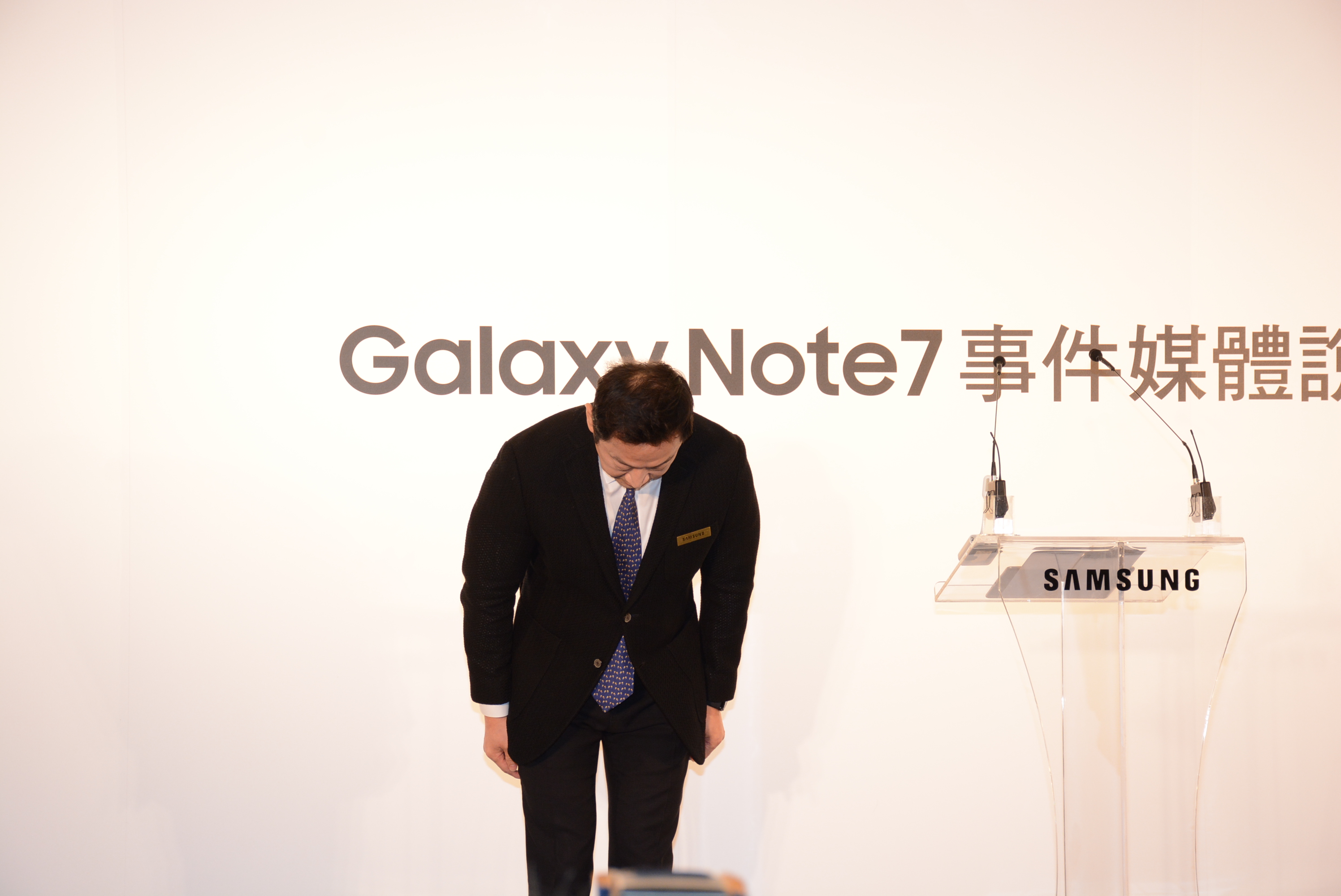 ▲台灣三星電子總經理李載燁為Galaxy Note7 事件造成的消費者恐慌鞠躬致歉。