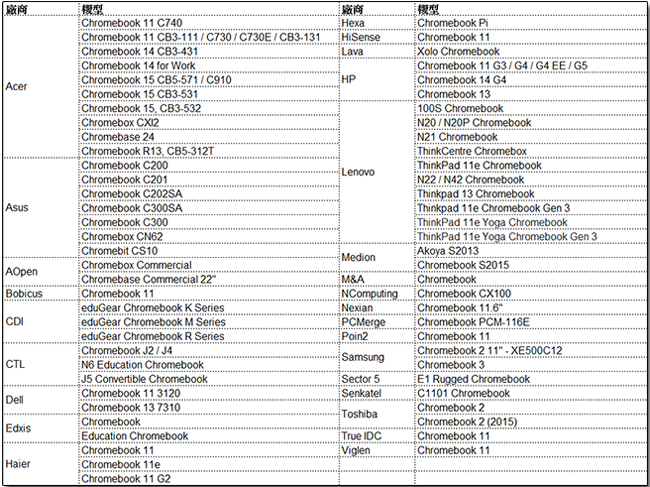 而今,Google 終於宣布凡 2017 年推出的所有新款 Chromebook 都將支援 Android 應用程式,此外還有一張長長的清單,清單中的舊款 Chromebook 也可以藉由軟體更新的方式讓原有的電腦具備 Android 應用程式功能,至少作業系統需為 53 以上才能擁有安裝 Android 應用程式的能力。除目前已支援的機型:Asus Chromebook Flip、Acer Chromebook R11 / C738T、Google Chromebook Pixel (2015) 外,以下則是之後將會支援的機型。
