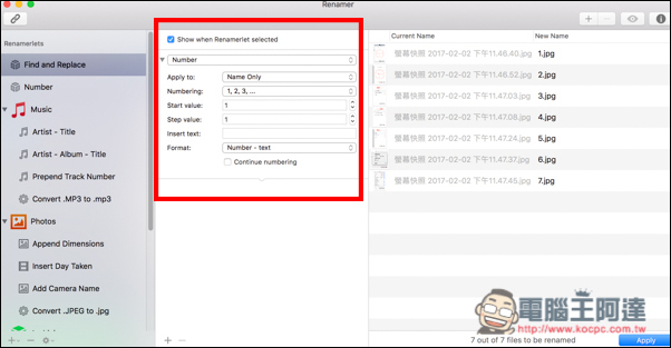螢幕截圖只是暫時,寫文就會刪除,因此用最簡單的「Number」即可解決,點選左側 Number 功能後,中間會出現一些細部調整的選項,如果是純數字的話上方改成 Name Only,最下方 Format 也改成 Text-number,並按下 Apple 後就完成啦!注意看右側視窗原本的螢幕快照xxxx 都變成 1、2、3、4….的順序,非常簡單且快速,終於不用再一個個手動修改了!