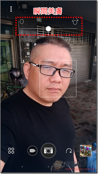 前置的 UltraPixel 鏡頭直接就內建「瞬間美膚」功能,拍照後就會自動幫您修修臉,如果還不滿意也可以自行設定曝光度與白平衡等選項: