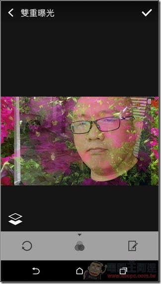 其中最有趣的是這次主打的「雙重曝光」,他可以選擇兩張不同的照片(如風景+人像)進行合成: