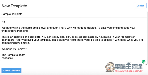 Templates for Gmail 只會紀錄郵件內容,不會記錄寄件人、收件人、郵件主旨等,因此 Sample Templates 位置為這內容的主題,不是郵件主旨哦!主要是方便你辨識,把常用的內容輸入在下方。