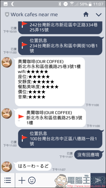▼使用 Cafe Nomad 小幫手只需要傳送位置訊息,就可以找那一帶的咖啡店。