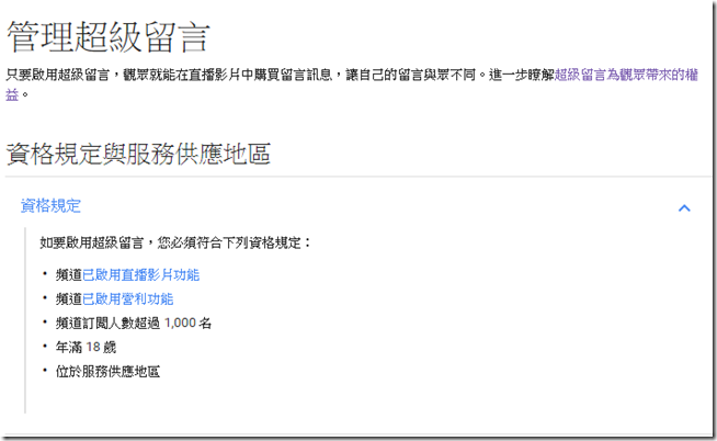 而這次除了開放 YouTube 手機版直播功能外,也同步開放一個名為「Super Chat」超級留言的功能,這個功能說穿了,就是觀眾可以贊助抖內他們所喜歡的實況主。而實況主想要打開這個功能的話,則本身的頻道必須要有一定以上的訂閱數(使用電腦直播的話要訂閱 1000 人,行動版直播的話要 10000 人訂閱),再加上你的頻道有開啟營利功能後,才能開啟超級留言這個功能。