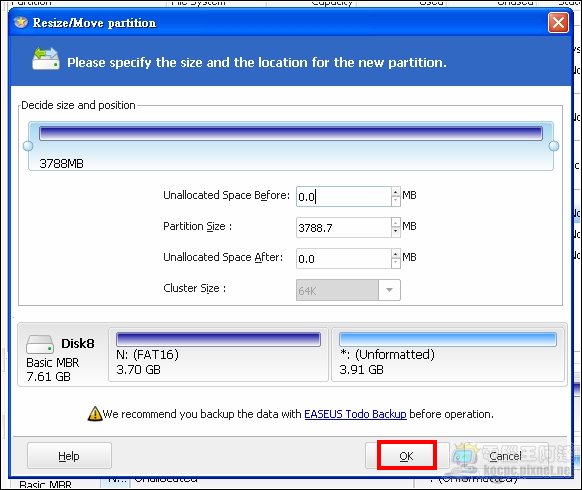 接著下面的空間以拉BAR的方式調整到您要的大小,如果您是16GB或32GB的話可以切多一點空間,筆者設定約一半的大小,設定完成後點選「OK」: