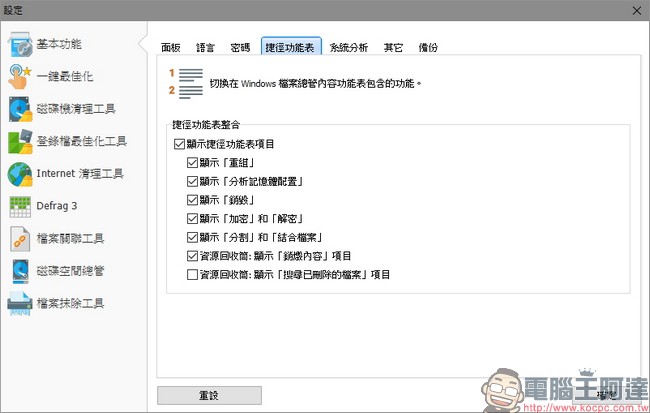 捷徑功能表預設會加入一些設定輔助使用,但也可以取消這些設定。