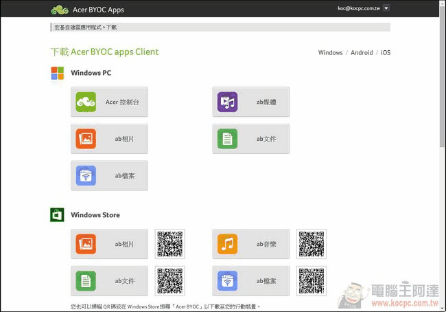 Acer BYOC Apps 包含了「ab相片」、「ab媒體」、「ab檔案」與「ab文件」等四個服務: