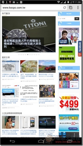 ACER Iconia Talk S 將虛擬按鍵固定在畫面右側,這樣的優點是在橫式瀏覽時,原本在下方的虛擬按鍵不會佔用了寶貴的畫面高度,可閱讀的面積也因此範圍變大了,稍微減少了壓迫感: