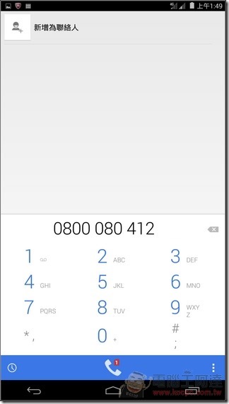 撥號介面部分,ACER Iconia Talk S 主要以選擇聯絡人撥號為主,也可以執行下方的撥號介面直接撥打電話,不過預設的撥號介面是由 SIM1 負責撥號,如果要自己選擇撥打門號的話就要手動修改設定值: