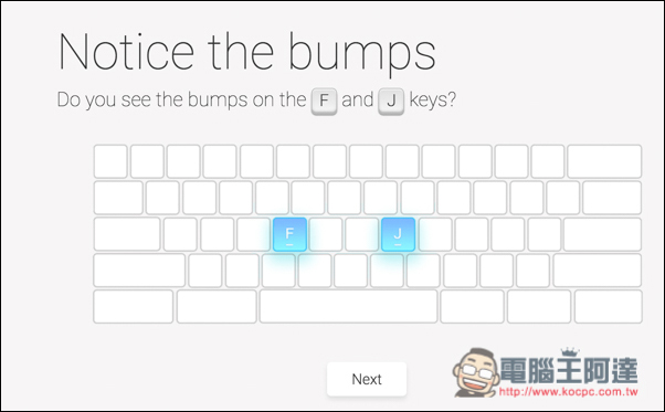 登入完成後會有一小段的教學,告訴你手該怎麼放、哪些區塊要用哪些手指來按等等。