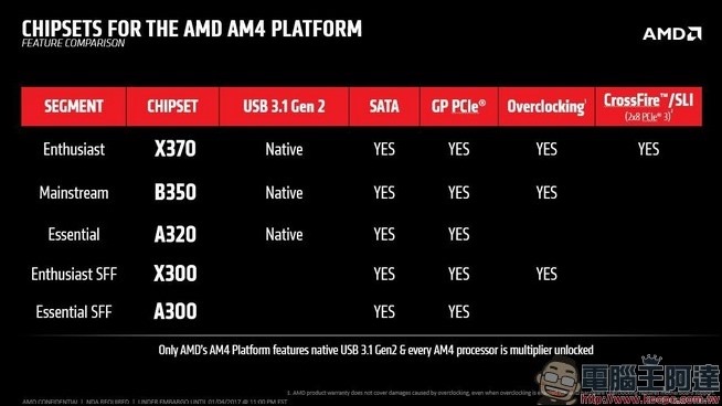 AMD設計了具靈活性的平台,基於同一晶片組的主機板可能包含不同的配置,更不用說與特定品牌綁定的部分額外功能。像是一鍵超頻,RGB燈光。來自 Asus,MSI,Gigabyte,ASRock和Biostar 的幾十張主機板將在 3月 2日推出日期上市。而 AM4 短期內還看不到被取代的機會,因為根據 AMD 的計畫, AM4 至少會活到 2020 年。雖然不知道這麼長的時間會推出哪些產品來使用這個平台,但這或許意味著晶片組特色已經只剩下簡單的規格差異,就算隔代對比也難以對照出效能表現。然而對即將採買 AMD 平台的玩家來說,多做點功課,補充點知識總是不錯的,起碼可以讓你知道你的需求適合什麼樣的晶片組。