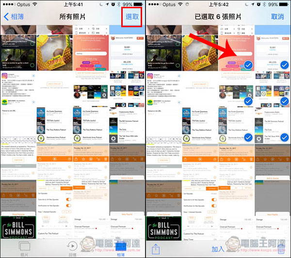 如果你想要刪除的照片是一整行或是全部,其實有一個小技巧,先左右輕滑要刪除的第一行照片,這幾張都會被選起來後,手指繼續輕碰螢幕,不要拿開,接著往下滑,每滑到的那行照片也會全部被選取,就看你要刪除幾行,全部的話就不斷往下或往上滑倒底就對了!