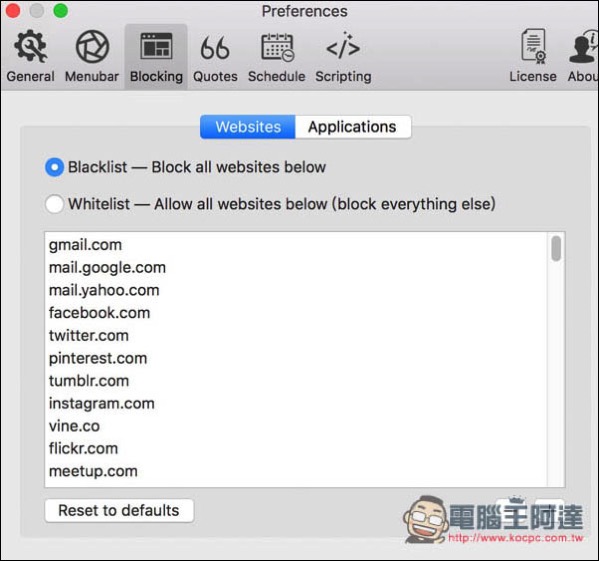 首先先打開 Preference 功能看有哪些網站被封鎖,,Focus 已內建非常多常用的網站,像 Facebook、Youtube、Twitter、Tumblr 等等都有,你不需要再手動加入。當然你也能移除預設的這幾個,像 Gmail 對某些人來說工作上會用到,不能把它封鎖。