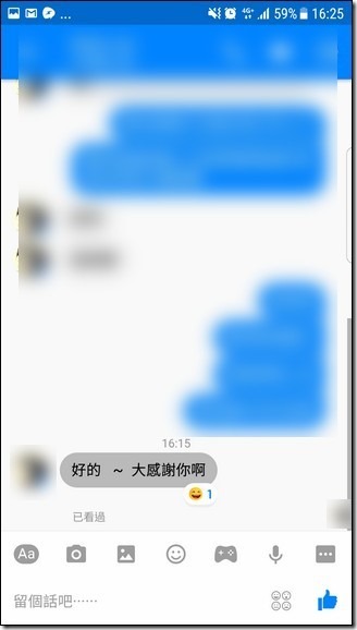今日 Messenger 突然釋出一個新功能,你可以在你與朋友的聊天室中,看到朋友「最後的訊息」旁邊出現一個小小的表情符號,不管事在電腦版還是手機版的 App 上點選那個灰色的表情符號的話,就可以馬上叫出一排表情列表。