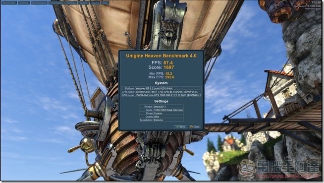 測試Unigine Heaven軟體時,設定所有特效等級皆為最高,解析度設為1920×1080,測得每秒平均畫面張數為67.4FPS,突破每秒60幀,遊戲畫面運行流暢: