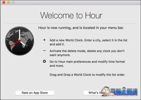 剛開啟 Hour – World Clock 會有簡易的功能介紹,有興趣的讀者可自行看看。