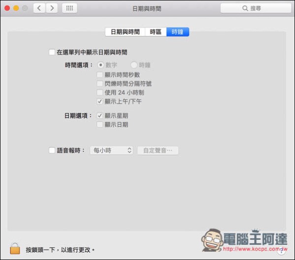 不過設定完後會出現一個問題,Menu bar 出現兩個時間,這時必須手動把內建的時鐘給關閉。