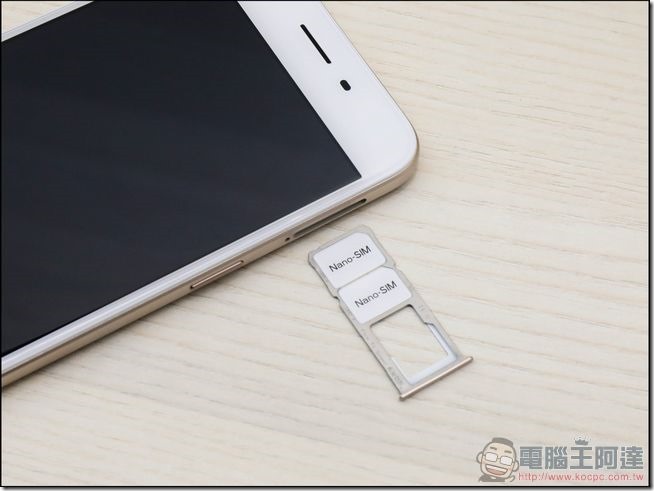 A57 配置了少見的三卡槽設計,支援 4G+3G 雙卡雙待與 2CA 行動上網能力,除了可安裝兩片SIM卡外,還可多裝一組擴充用的 Micro SD 卡(最高可擴充到 256GB),這樣的配置阿達個人相當喜歡,既保留了雙卡機的優點,也不會因為要安裝記憶卡而無法使用第二組 SIM 卡槽: