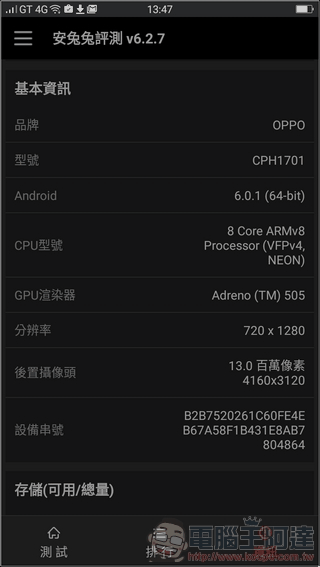 效能部分, A57 使用的是最新的 Qualcomm Snapdragon 435 八核心處理器、3GB RAM、32GB ROM(可用空間為 22GB 左右),算是目前入門規格的頂級配置,整體操作的體驗其實蠻流暢的,不運行大型電玩的話,FB、LINE、一般遊戲都跑得很愉快: