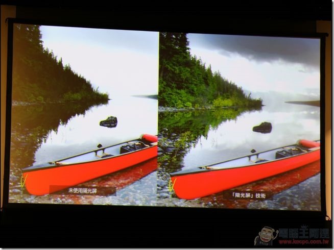 陽光屏展示,可看到當光線照射時,畫面上的照片只有暗部對比調亮,所以原本畫面亮部不變,只有暗部變亮: