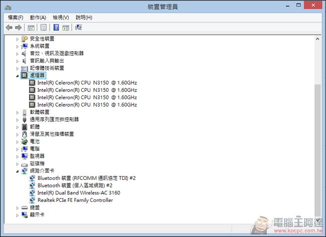 裝置管理員重點硬體規格清單,內建藍牙、802.11ac 5GHz 高速無線網路等硬體: