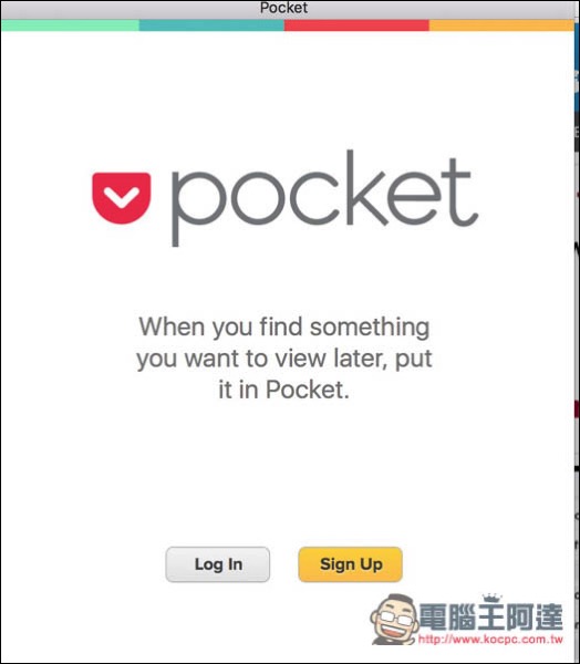 首次使用 Pocket 時,必須申請帳號,這樣才能在各裝置中同步(像是你在 Mac 裡儲存的內容,iPhone 也會出現),點選 Sign Up 進行註冊。