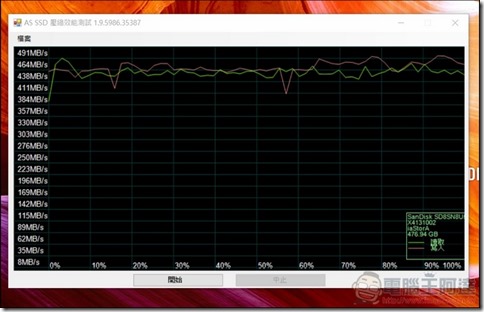 以下是 UX430 的 SanDisk SD8SN8U512G1002 SATA3 SSD 速度測試,讀寫速度平均在 4~500MB/s 左右,而且從 Compression-Benchmark 來看,其讀寫速率的表現相當穩定: