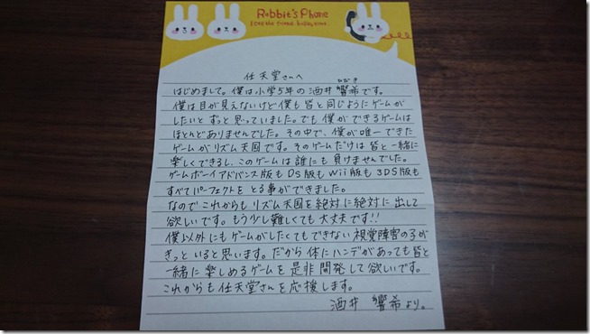 日本有位視障的小學生,因為十分熱愛「 節奏天國 」這款遊戲,但是推出這款遊戲的任天堂許久沒有推出續作,所以他寫了一封信給任天堂,沒想到,任天堂用了一個非常誠摯的方式回信給這位小學生:一封點字版的信件。