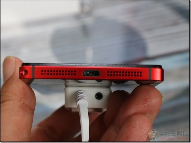 機身下方則是立體聲喇叭與Mico USB 連接埠,上方配置了 3.5 mm 耳機孔與抑噪MIC: