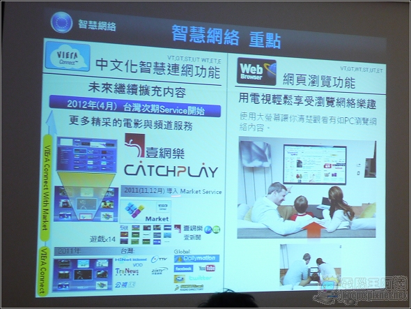 「NetWorking 智慧網路」:這兩年電視的大趨勢之一就是具有聯網功能「SMART TV」,Panasonic的「SMART VIERA」除了一般的網頁瀏覽、YouTube播放功能以外,還獨家內建了「壹網樂」與「CATCHPLAY」功能。