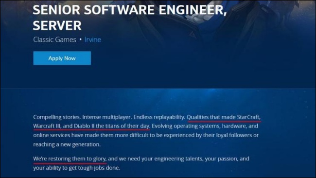 徵人情報中的一句「We’re restoring them to glory」令人有些聯想,這是暴雪公司最近為資深軟體暨伺服器工程師職缺的第一段說明。這段話引出了一些人的好奇,畢竟不久前我們看到了許多重製遊戲宣布發表或即將發表,暴雪自己不久前也為經典的 StarCraft II 推出高畫質重製版本。因此這項職缺或許是為了將來替其他暴雪經典遊戲開發高畫質重製版本。