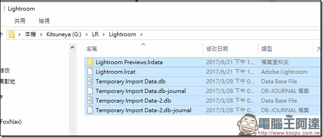 Step 03:然後此時你會被導引到 Lightroom 的編目資料夾中,這個時候請手動關閉你的Lightroom、請手動關閉你的Lightroom、請手動關閉你的Lightroom(因為很重要,所以要說三次。)接著依照下圖選擇這五個檔案與兩個資料夾剪下。