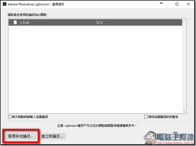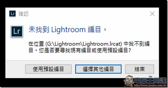 Step 06:當檔案搬移完畢後,你打開 Lightroom 時,他將會跳出一個視窗,說找不到編目(因為已經被你搬走了),所以你要點選「選擇其他編目」來指定位置。